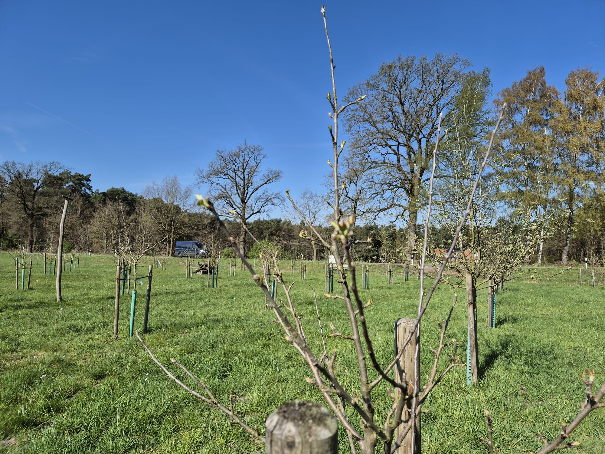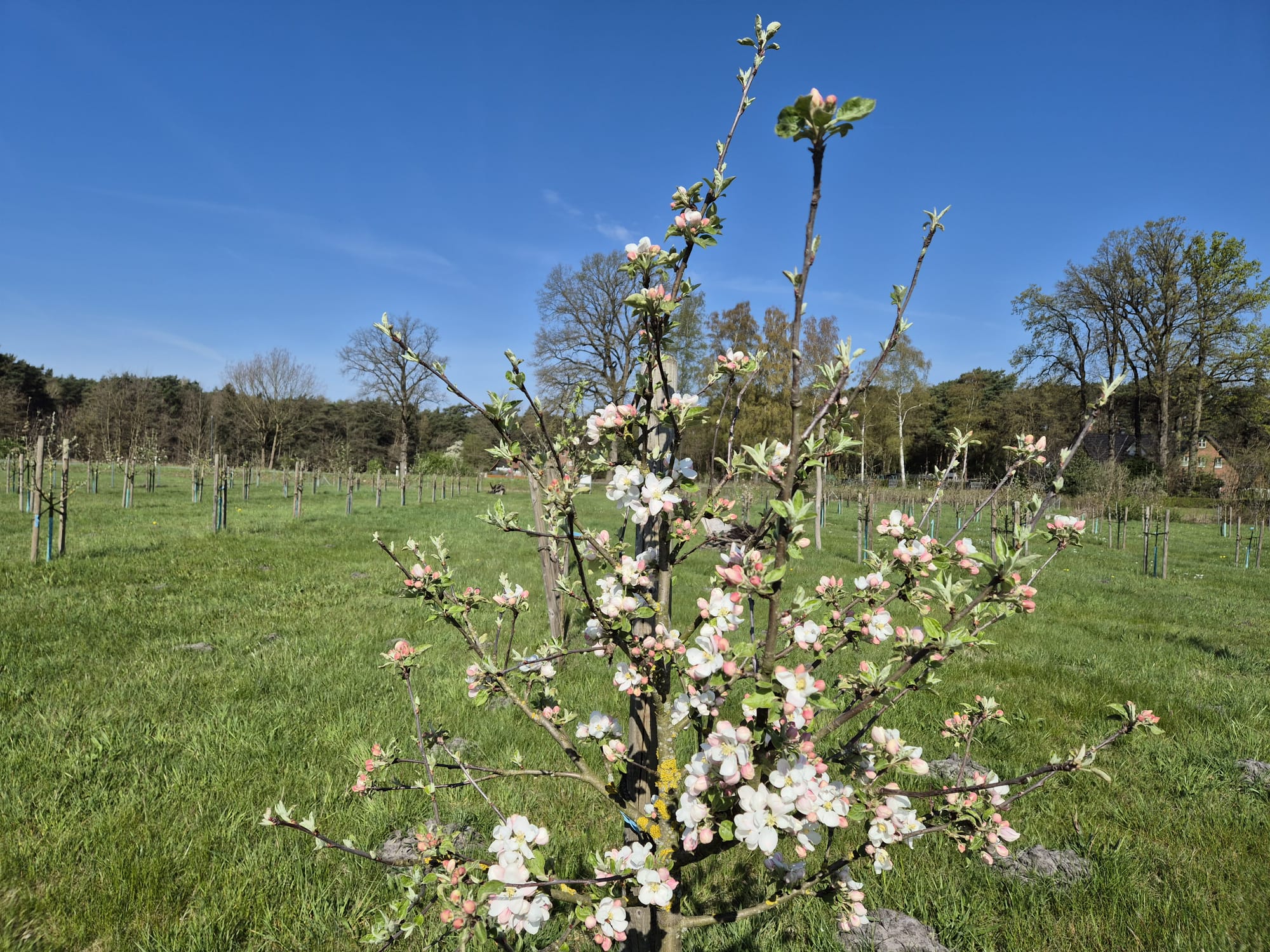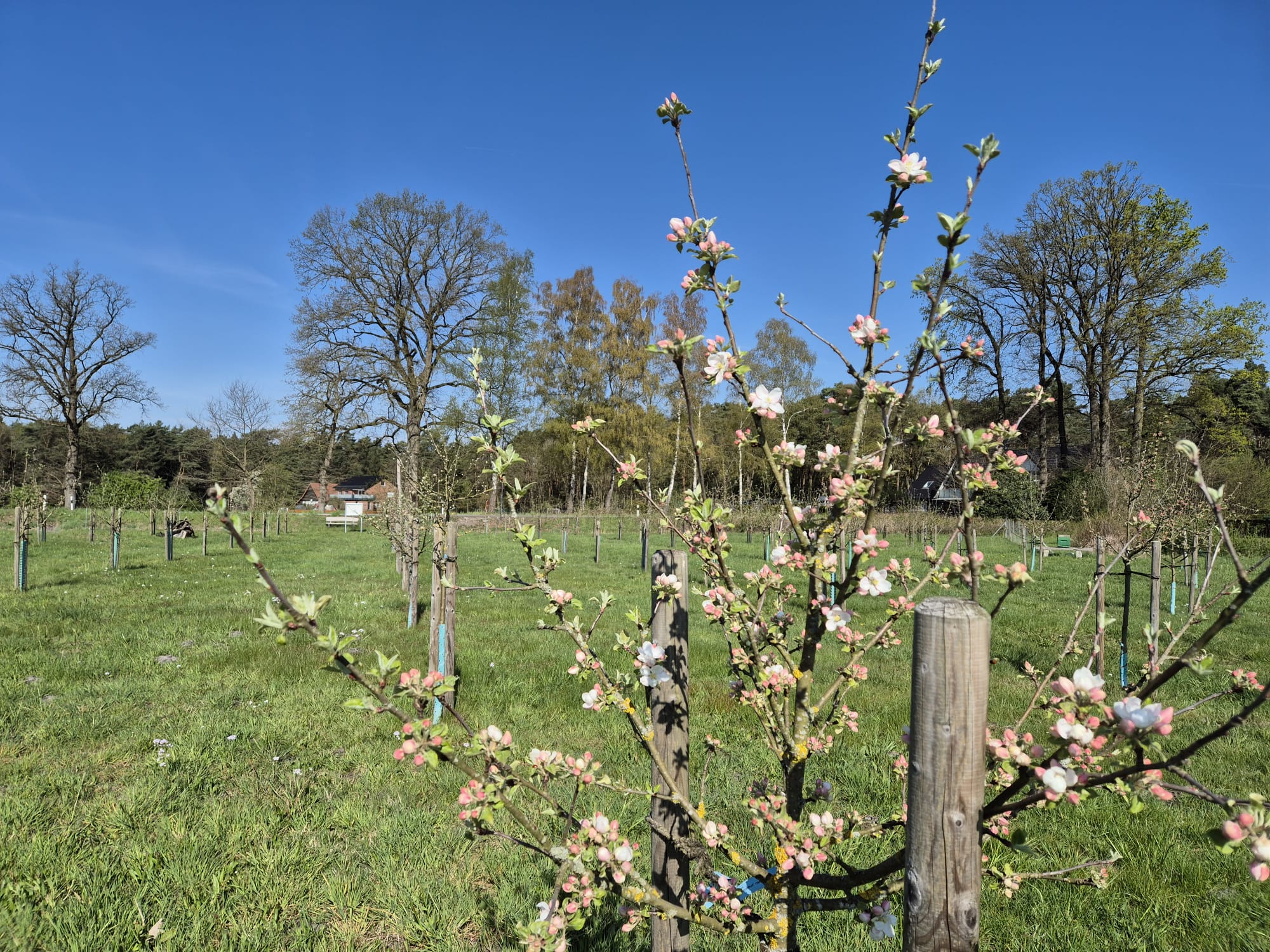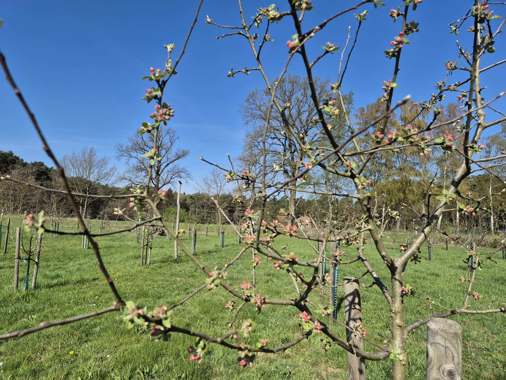 Auf unserer Streuobstwiese gibt es schöne Neuigkeiten: Die ersten Bäume haben bereits zu blühen begonnen und setzen zarte Farbakzente in die noch ruhige Landschaft. Bis die Wiese jedoch in ihrer vollen, bunten Pracht erstrahlt, wird es noch ein paar Tage dauern. Jetzt heißt es geduldig bleiben und die Entwicklung beobachten. Bleibt zu hoffen, dass uns kein Frost mehr überrascht, damit sich die Blüten ungestört entfalten können und wir uns am Ende über eine gute Ernte freuen dürfen.